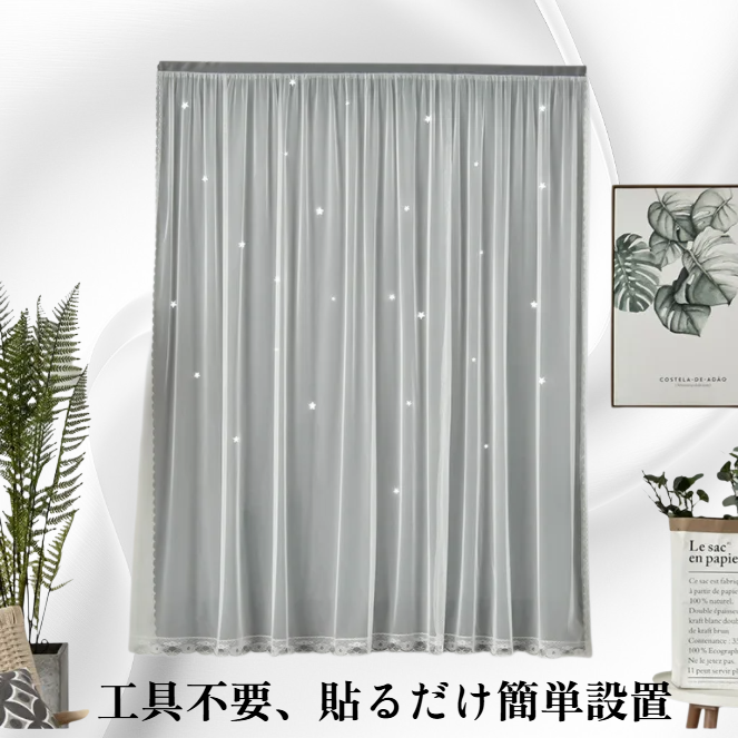 完成品ショートカーテンは貼るだけ簡単設置。レンタルルームや短期利用に最適。遮光機能付きでプライバシー保護と快適空間を実現。